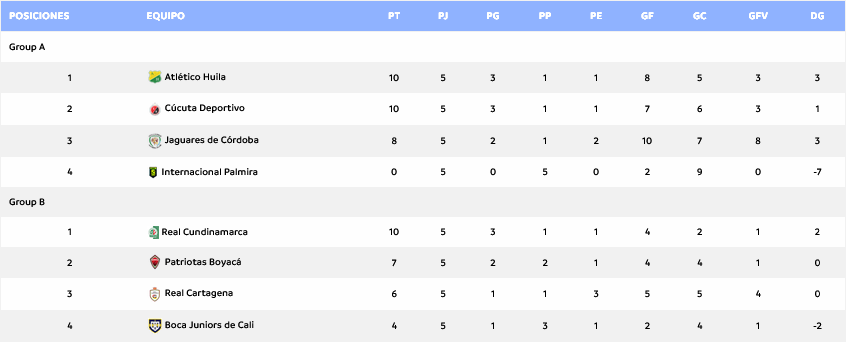 Con estos resultados, Cundinamarca se mantiene en la primera casilla del grupo B con 10 puntos, mientras que Patriotas sigue en segundo lugar con 7. En tanto, Cartagena y Boca quedan eliminados con 6 y 4 unidades, respectivamente.