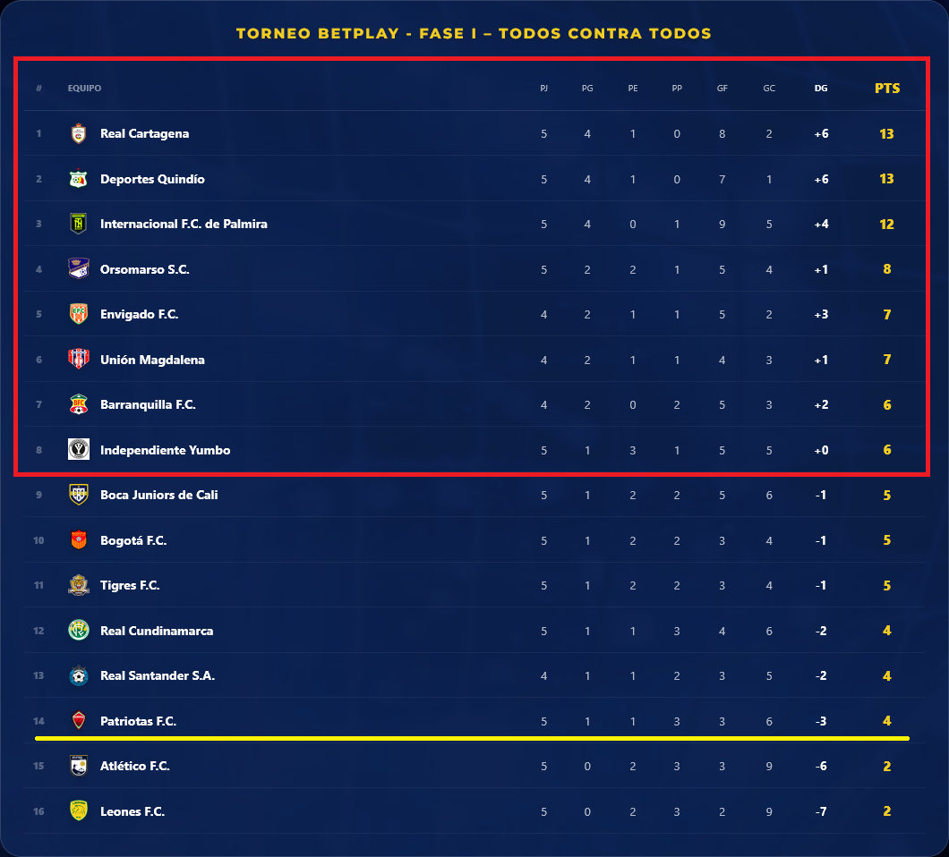 En la casilla 14, a dos puestos del último, aparece Patriotas Boyacá, con cuatro puntos de 15 posibles y una diferencia de gol de -3. Más abajo están Atlético, con dos y -6, y Leones, con dos y -7.